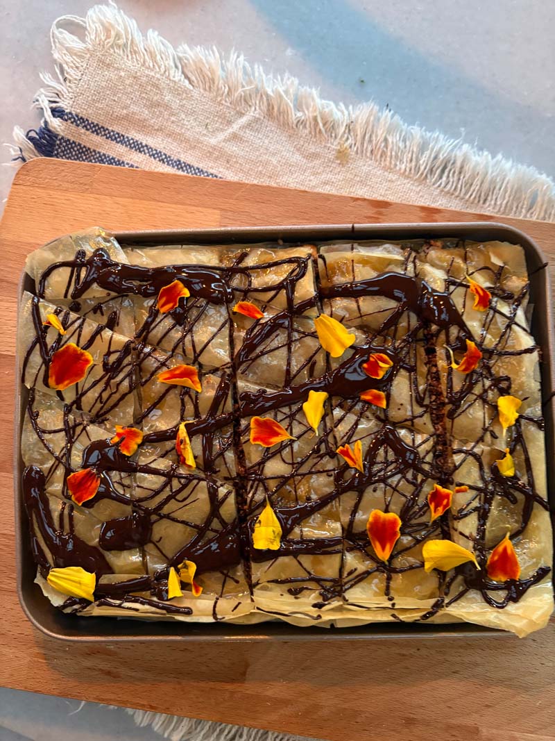 Auch wenn ich selbst kein großer Nachtisch-Fan bin, haben die Desserts dieser Woche etwas Besonderes. Wir arbeiten mit hauchdünnem Filoteig für ein Baklava, das Schicht für Schicht entsteht und am Ende einfacher zuzubereiten ist, als ich dachte. Ein Schokoladensoufflé kommt duftend und warm aus dem Ofen. Dann ist da die Crema Catalana, deren Zucker mit einem kleinen Brenner karamellisiert wird, bis er knackt und duftet. Der Moment, wenn die Löffelspitze die Kruste durchbricht, ist jedes Mal ein kleiner Zauber. Und schließlich der” burnt Feta and Honey Cheesecake “mit gebackenen Pfirsichen, Thymian und Mandeln, ein Nachtisch zum Niederknien.