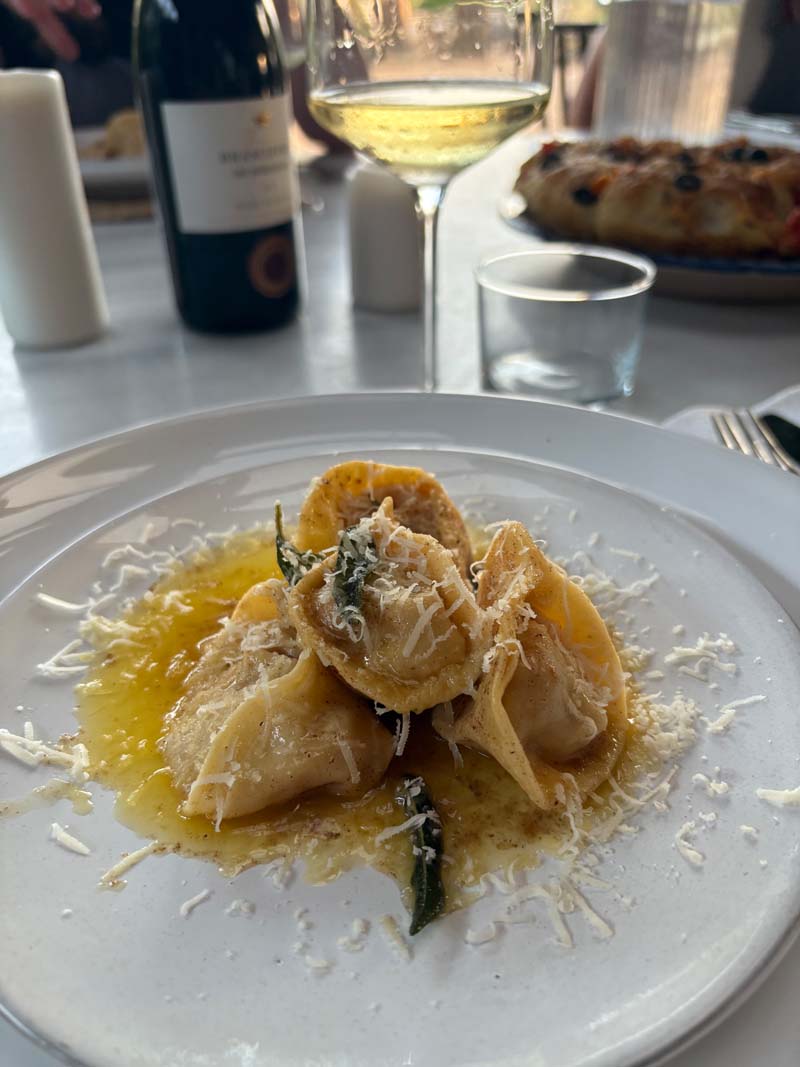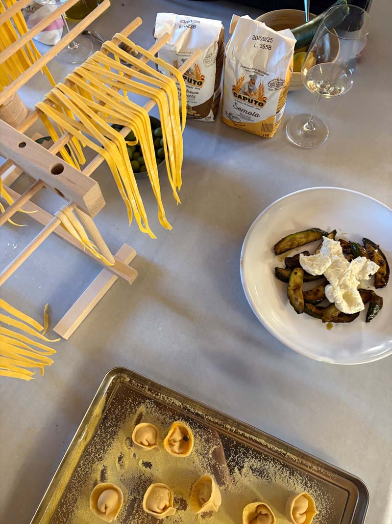Daraus formen wir Tortelloni mit Kürbisfüllung, die wir später in zarter Salbeibutter servieren. Wir schneiden frische Fettuccine, die mit einem Venetian Chicken Ragu auf den Tisch kommen, kräftig und aromatisch. Dazu backen wir Focaccia, außen knusprig, innen weich, perfekt zum Eintauchen in Olivenöl.