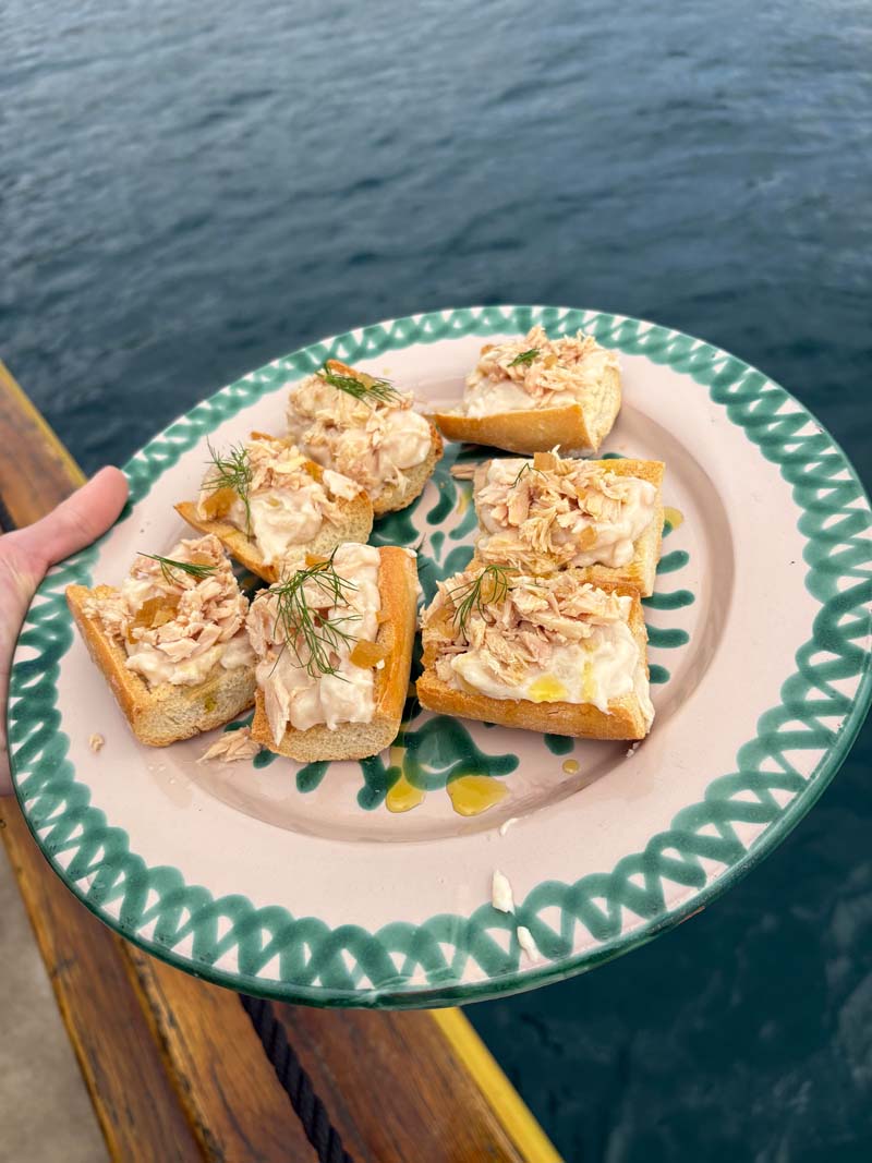 Es gibt Wein, Octopus-Carpaccio, gefüllte Aprikosen, Radicchio mit Trauben und Ziegenkäse Salat, dazu Thunfisch-Bruschetta. Jeder Teller ist mit Liebe angerichtet, jedes Detail sitzt. Dazu das Rauschen der Wellen, die salzige Luft, die Sonne im Gesicht. Kein klassisches Sightseeing, sondern ein kulinarisches Erlebnis auf dem Meer.