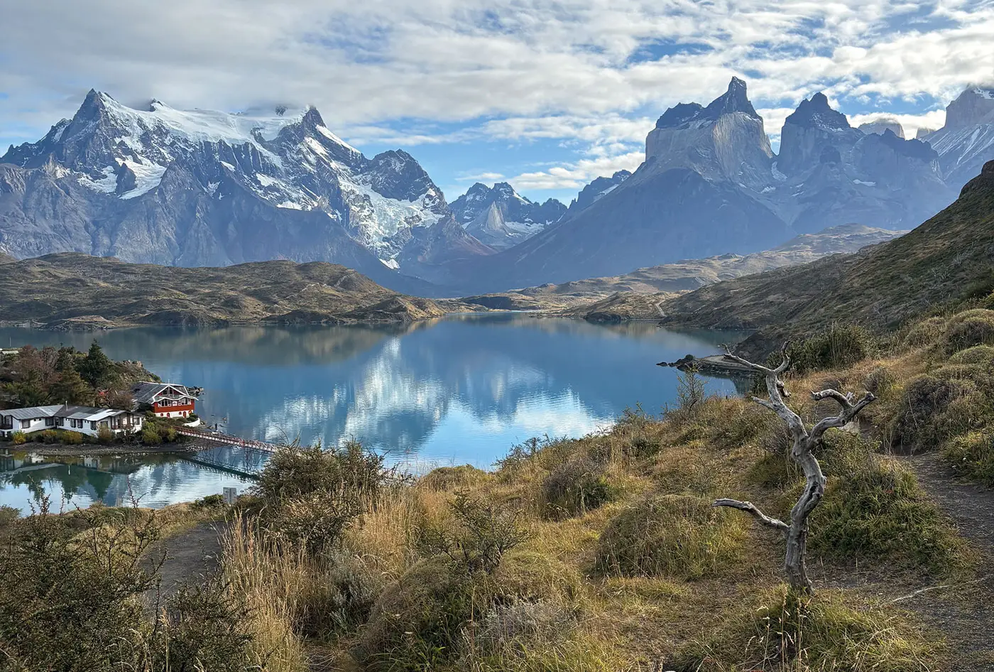 Wie eine silberne Schlange windet sich tief unter uns der Río Serrano durch ein riesiges, gelb-grünes Tal. Ringsum mächtige Berge, Gletscherzungen in der Ferne, ein Panorama wie gemalt, als hätte jemand eine XXL-Leinwand aufgespannt. Ganz links, eingebettet in diese Szene, ein paar grüne Dächer direkt an einer Flussschleife, unser Hotel für die nächsten sechs Nächte. Was für ein Ort.