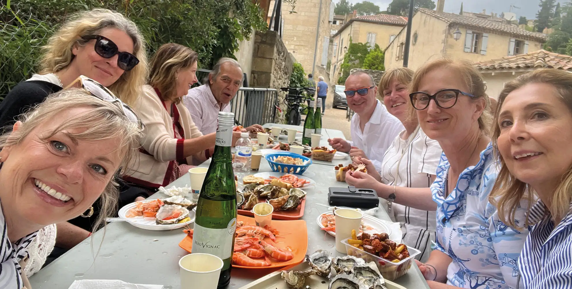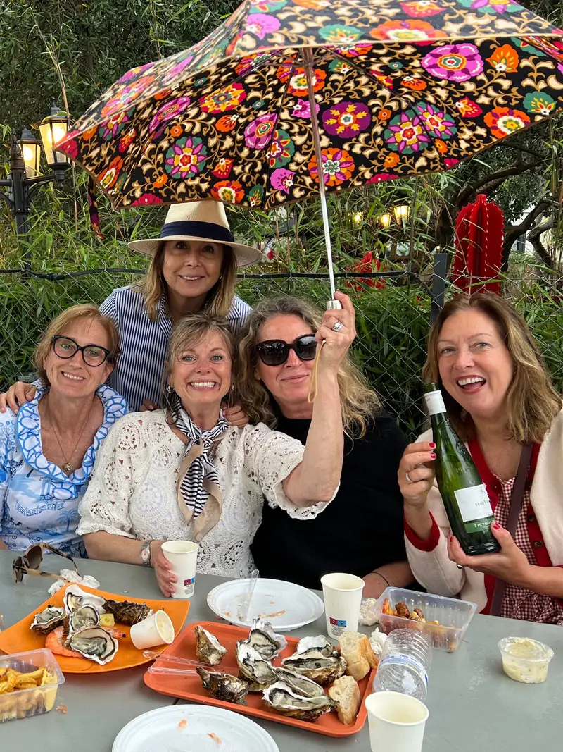 Mittags treffen wir die anderen zum Essen. Austern, Shrimps, Merguez, dazu reichlich Wein. Um 13 Uhr sind wir bereits beschwingt. Als Regen einsetzt, springt Debra aus Denver auf, tanzt und bringt die Band dazu, „Singing in the Rain“ zu spielen. Costas macht mit voller Lebensfreude. Es gießt in Strömen, wir sind durchnässt, aber glücklich. Einer dieser Momente, die bleiben.