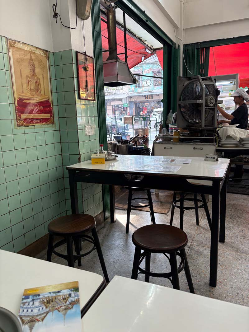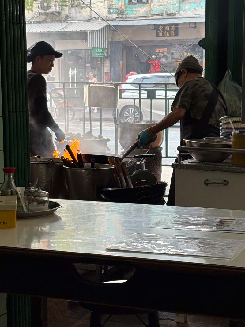 Am Nachmittag mache ich mich zu Fuß auf den Weg, erst über den berühmten Blumenmarkt, dann weiter zu einem Ort, den ich mir fest vorgenommen hatte: Jay Fai, die „Krabbenkönigin“. Sie ist 77 Jahre alt, betreibt ein kleines Streetfood-Restaurant mit offener Küche und wurde 2017 mit einem Michelin-Stern ausgezeichnet. Wer hier essen will, braucht Geduld. Ich stelle mich an, warte lange und ergattere schließlich einen der kleinen Plastikstühle vor den grün gekachelten Wänden.