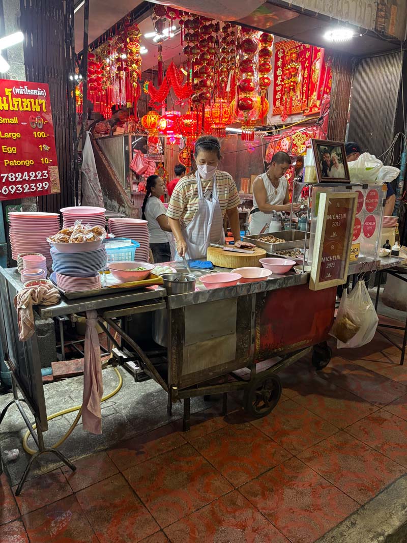 An meinem letzten Tag in Bangkok lasse ich mich noch einmal mitreißen. Direkt vor dem Hotel springe ich spontan in einen Tuk-Tuk Richtung Chinatown. Eigentlich hatte ich diesen Besuch für den Abend geplant, aber in Bangkok entscheidet oft der Moment. Es ist heiß, laut und bunt, und überall liegt Plastik. Doch sobald man die Hauptstraßen verlässt, begegnet man wieder dem echten Leben. Händlerinnen kochen am Straßenrand, bauen Stände auf und wieder ab. Das Leben spielt sich direkt auf dem Asphalt ab. Ich setze mich in ein kleines Lokal, bestelle ein kühles Bier und beobachte die Szene.